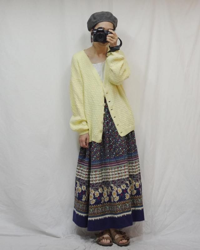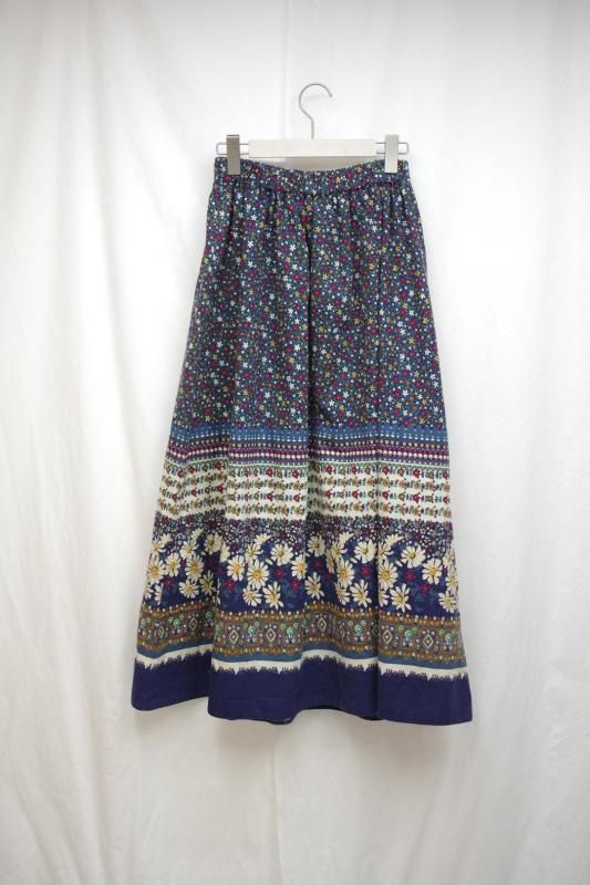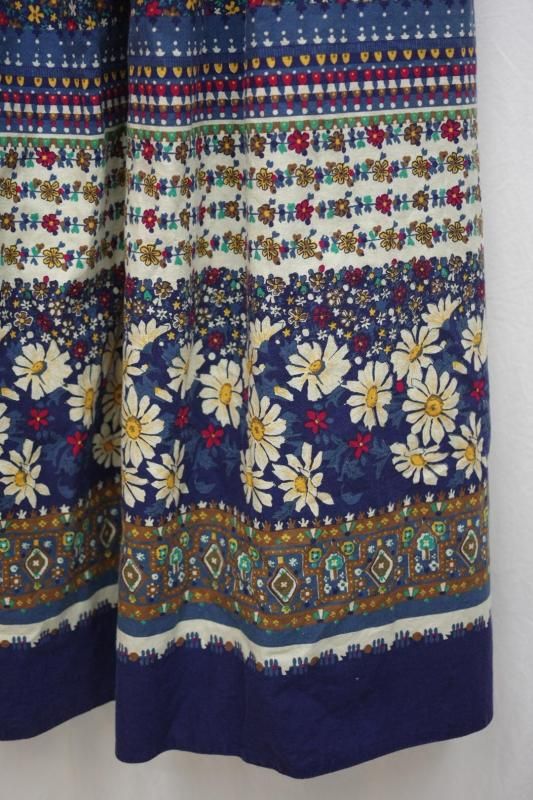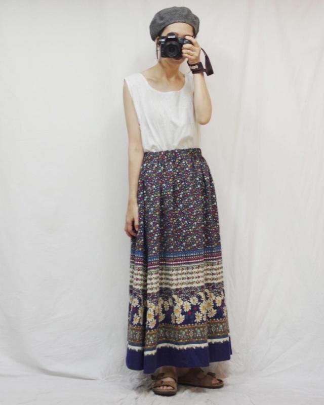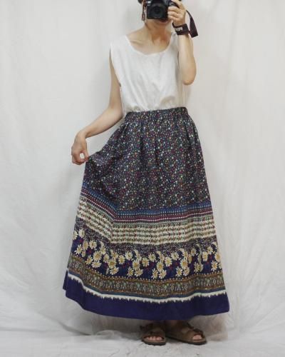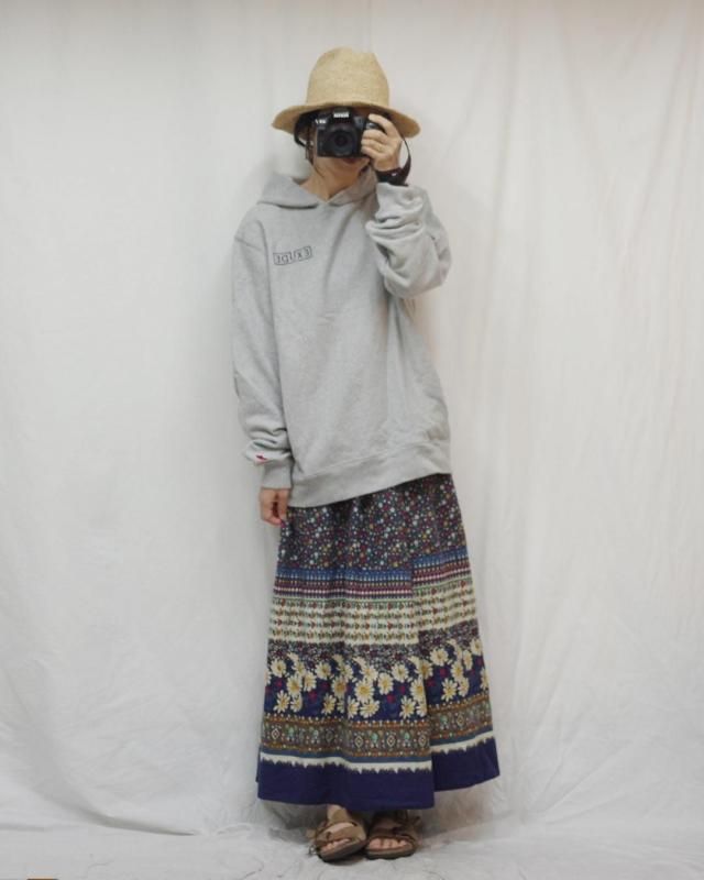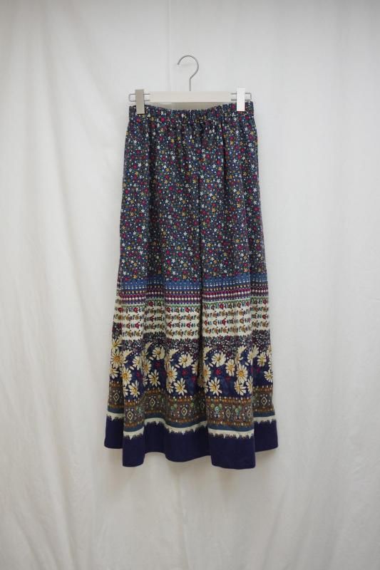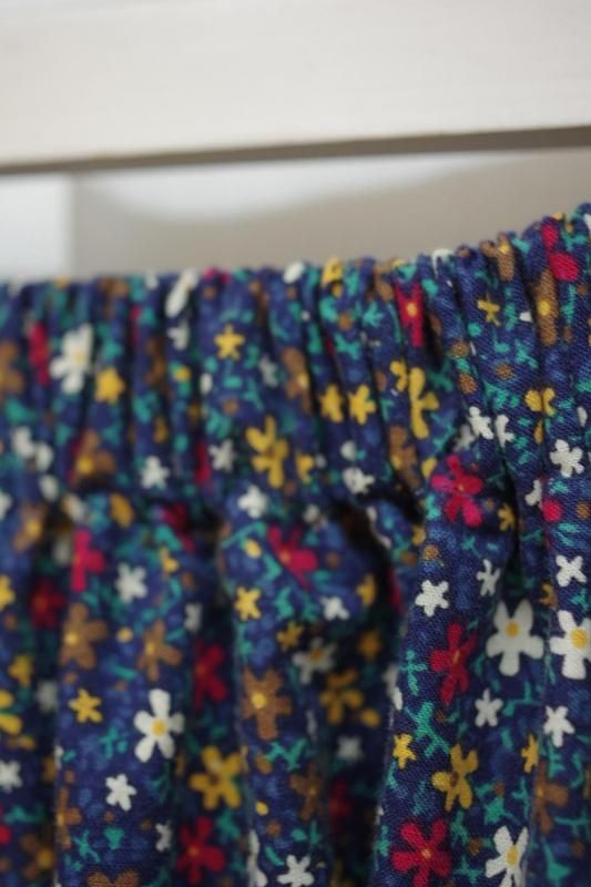 コットンと思われるプリント生地はたっぷりと使われ、ウエストはゴムの仕様でほぼフリーサイズ。